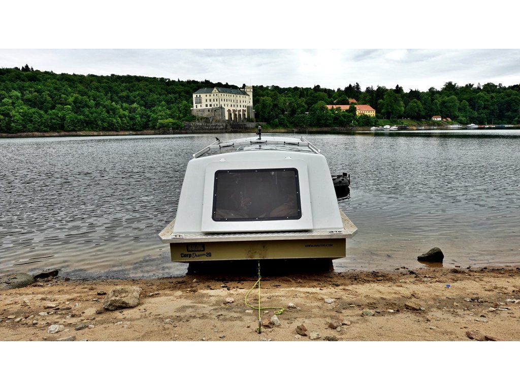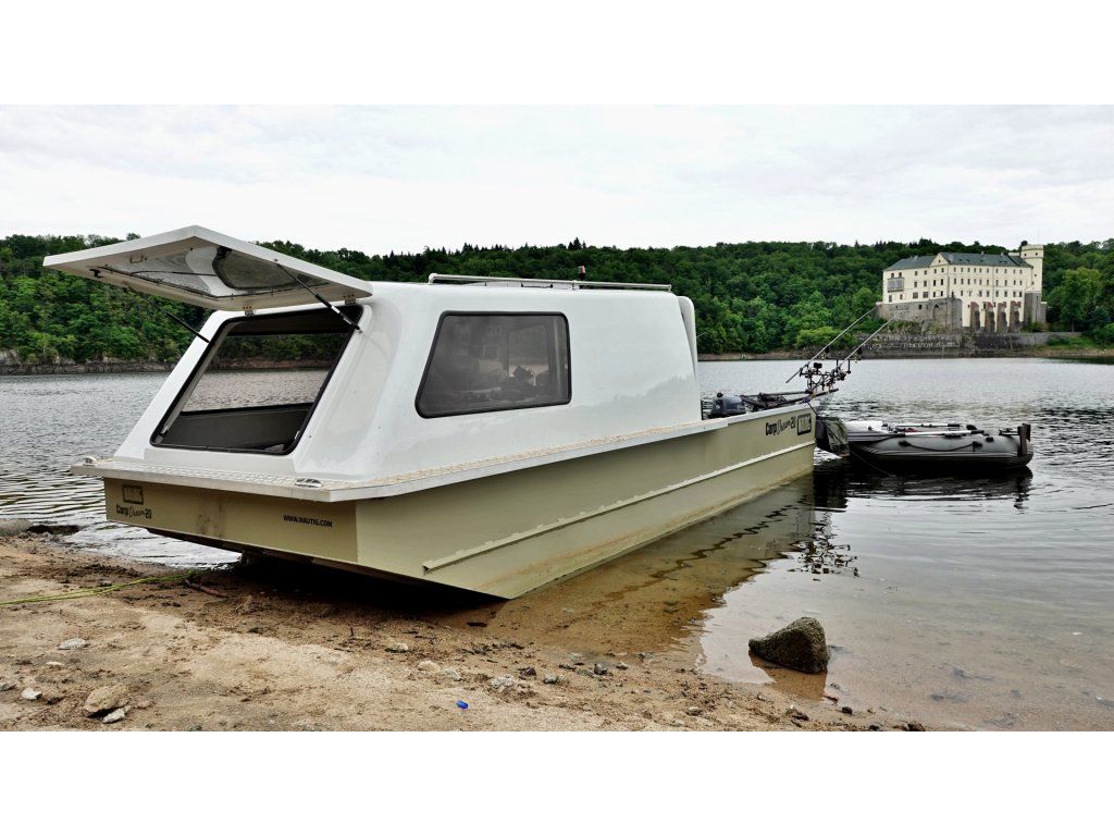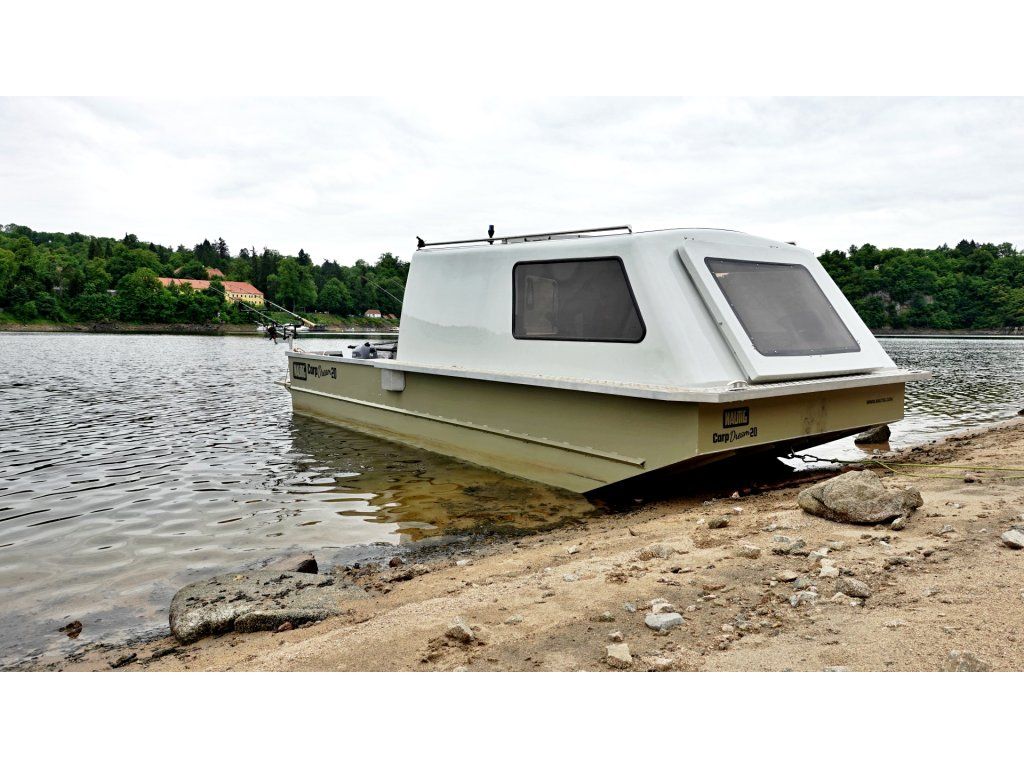 Profesionální CARP BOAT celosvařovaný hliníkový rybářský člun s pevnou kajutou. Loď je určená pro rybáře, je s plochým dnem a bržděným přívěsem.